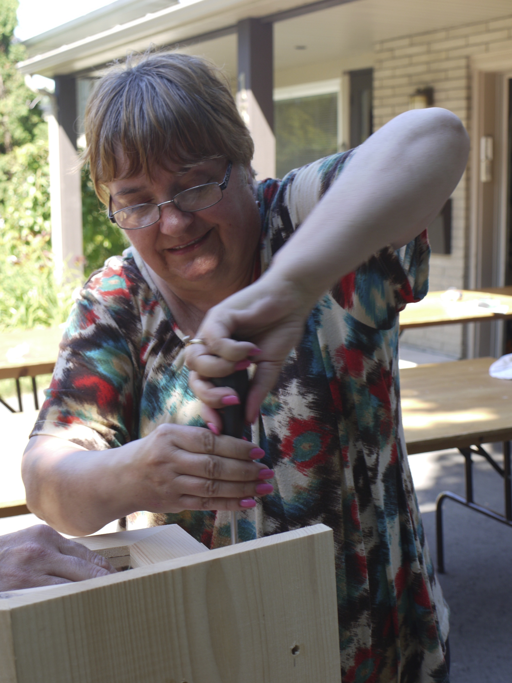 Regional Councillor Jane Mitchell assembling a Little Libraries of KW kit for the Sunnydale Community Centre